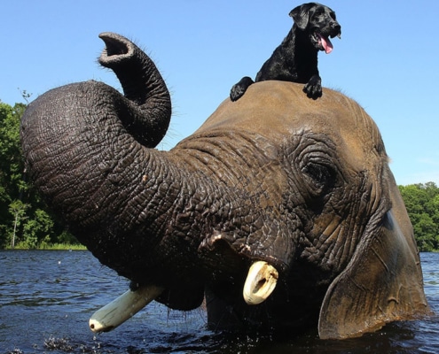 Some relationships have become internationally famous and have given zoologists a rare opportunity to study this behaviour. Among the most bizarre are Roscoe the coon hound and Suryia the orangutan and just as extraordinary Bubbles the elephant with Bella the dog. Not just because of what appears to be an “unnatural” relationship but the sheer joy that these animals generate as they take so much pleasure in each other’s company.